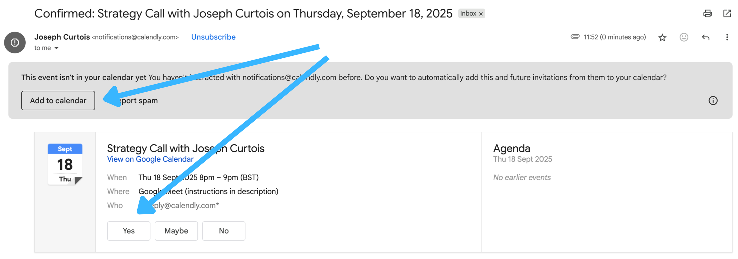 Search Your Inbox For “Strategy Call”. Click “Add To Calendar” And “Yes” For The Calendar Invitation